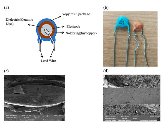Ceramic disc capacitors are constructed by applying silver contacts to both faces of a ceramic disc (shown in Figure 14a). Here, the ceramic disc serves as the dielectric material, while the silver coating on both sides functions as the electrodes of the capacitor. The leads, made of copper, are welded to the ceramic disc to establish electrical connections. Figure 14b shows actual images of ceramic disc capacitors. When its cross-section is placed under a scanning electron microscope, the observed images are shown in Figure 14c,d.
