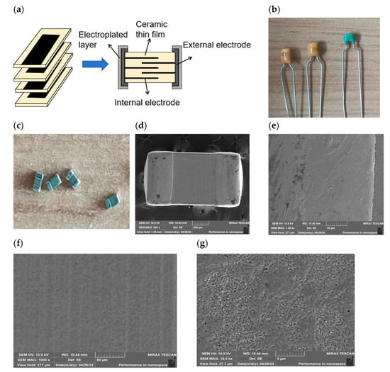 The MLCC is fabricated by stacking multiple layers of ceramic material interspersed with conductive electrodes [67,68]. Each layer of ceramic material sandwiches the electrodes, serving as the dielectric for the capacitor. These multilayer ceramic media and electrodes are interconnected through the terminal’s surface, creating a compact and efficient structure. In other words, the MLCC is constructed by alternately layering ceramic dielectric membranes (commonly rutile titanium dioxide or barium titanate) with printed electrodes (inner electrodes) in a staggered configuration. This assembly is then consolidated into a ceramic chip through a single high-temperature sintering process. Subsequently, a metal layer (outer electrode) is applied to both ends of the chip, completing the manufacturing process. Its structure is shown in Figure 15a. The MLCC boasts not only the benefits of standard ceramic dielectric capacitors but also exhibits a range of exceptional characteristics. These include compact size, substantial capacity, high mechanical strength, excellent moisture resistance, outstanding high-frequency performance, and remarkable reliability [69,70]. Given its versatility and superior performance, the MLCC finds widespread application in various electronic information fields, encompassing mobile phones, computers, the military industry, aerospace, and beyond [71,72]. The packaging forms of MLCC mainly include wire-bonded and surface-mount types. The wire-bonded type was previously known as the monolithic capacitor (shown in Figure 15b). Its name originated from the fact that the ceramic dielectric body coated with metal electrodes is sintered with the electrodes into a single unit, resembling a stone block, hence the name “monolithic capacitor.” Removing the leads from the monolithic capacitor results in the surface-mount packaging form (shown in Figure 15c). The observed images of the surface-mount type MLCC placed under a scanning electron microscope are shown in Figure 15d–g.