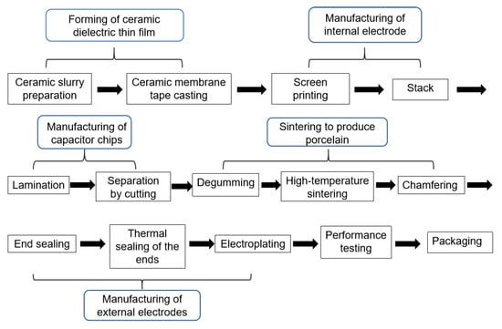 The production of surface-mount MLCC encompasses multiple processes, including the formation of ceramic dielectric films, the fabrication of inner electrodes, the creation of capacitor chips, sintering them into ceramics, the construction of outer electrodes, performance testing, and packaging, among others [64,73,74]. The specific process diagram is shown in Figure 16. Firstly, the dielectric powder is mixed with solvents, dispersants, binders, and plasticizers to form a homogeneous suspension. This slurry is then transferred to a casting machine, where a scraper evenly applies it onto a tape. The tape, coated with the mixed slurry, is sent to a tape-casting machine where a doctor blade precisely scrapes the slurry onto it. The resulting wet sheet is subsequently dried, transforming into a flexible tape. Next, an electrode paste is applied to the tape in a designed pattern through screen printing. During the lamination process, the printed tapes are stacked layer by layer with precision alignment. After cutting and separation, each green MLCC undergoes high-temperature sintering to eliminate the adhesive and organic matter. This sintering process also solidifies the layers of dielectric tape and electrodes, creating a dense structure. Additionally, the sintered ceramic is chamfered to fully expose the inner electrodes.