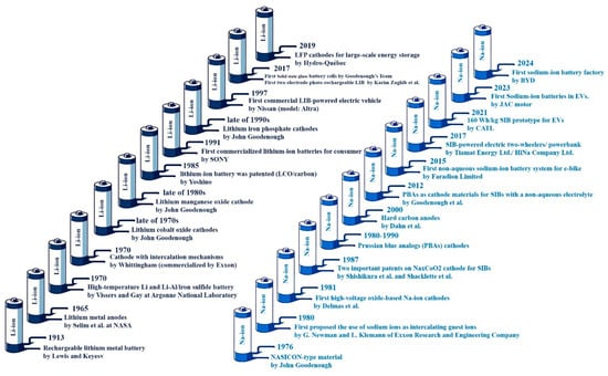 LIBs and SIBs historical evolution, from the early stages to commercialization. Data was drawn from [,,,,,,,,,,,,,] for LIBs and from [,,,,,,,] for SIBs.