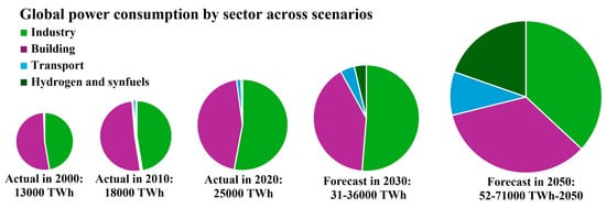 The demand for energy is growing exponentially because of rapid technological progress and the increasing population. As a result, transitioning from traditional fossil fuels to more sustainable and environmentally friendly alternatives is mandatory. Global electricity demand rise is expected from 25,000 TWh to 52,000–71,000 TWh by 2050 due to expanding markets and broader electrification (Figure 3). The transport sector will also observe a substantial increase in power needs, with passenger EVs reaching 1.3 billion by 2050. Industrial power demand is likely to double by 2050 with the electrification of specific processes and increased data center needs. Similarly, building power demand will double further electrification [].