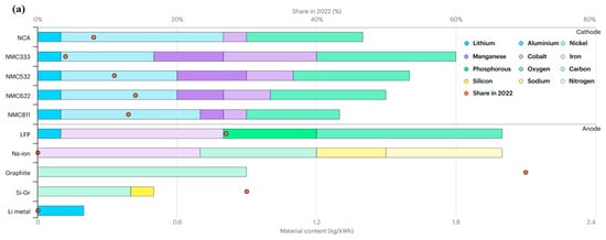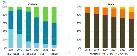 (a) Material content in alternative anodes and cathodes in EV batteries in 2022. (b) Sale share in cathode and anode chemistries, 2018–2023. Low-nickel chemistries are comprised of NMC333 and NMC532, whereas high-nickel ones are NMC622, NMC721, NMC811, lithium nickel manganese cobalt aluminum oxide (NMCA), and lithium nickel cobalt aluminum oxide (NCA). Si-Gr means silicon-doped graphite with a percentage share of silicon. Sales share is measured based on capacity. With permission from [] for (a) and [] for (b).