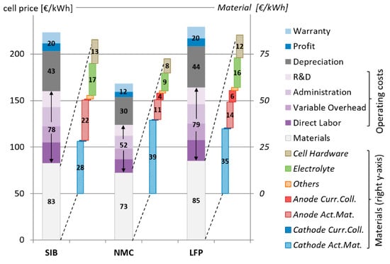 Figure 6 shows the final cell pricing derived for three distinct battery chemistries. The LFP battery has the greatest storage capacity price per kWh (229.3 €/kWh), followed by the SIB (223.4 €/kWh). The NMC-type LIB is the cheapest (168.5 €/kWh), owing to its high energy density. The material costs account for 37% to 42% of the finished cell price, with a further 18–19% representing investment expenses (depreciation). These figures are much lower than those reported by Vaalma et al. [], who compared the material prices of an 11.5 kWh SIB and LIB. However, Vaalma et al. did not evaluate the battery at the cell level; instead, they evaluated it as a complete battery pack. The additional peripheral components and decreased energy density increased the cost per kWh of storage capacity. When material costs are calculated without the cell hardware, figures in the same order of magnitude are found, with the main cause for the variances being the varied energy densities of the modeled batteries and variable cathode compositions. The manufacturing plant (including R&D) provides 32–35%. Naturally, these (and thus the final cell price) depend highly on plant size and annual throughput. This is one of the reasons for the wide range of prices reported in the literature, with values ranging from 145 to 289 €/kWh for NMC and 225 to 303 €/kWh for LFP [].