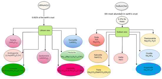 Sodium is a promising substitute for lithium in battery systems due to its chemical and physical similarities to lithium. Sodium and lithium are present in varying concentrations in seawater and the Earth’s crust. Understanding lithium and sodium ore’s geological distribution and processing is paramount for sustainable and efficient resource utilization. Sodium ores present a significant contrast to lithium in abundance and diversity. Despite comprising only 0.002% of the Earth’s crust, lithium is a critical component in high-density batteries. Its ores, such as spodumene (LiAl(SiO3)2), petalite (LiAlSi4O10), and lepidolite (K(Li, Al)3(Al, Si)4O10(F, OH)2) (Figure 7), are extensively mined and processed to meet the escalating demand, primarily driven by the EV market and portable electronics industries [,,,,]. Cobalt is among the least abundant metals (25 ppm), while nickel is relatively more abundant at 84 ppm in the earth’s crust [].