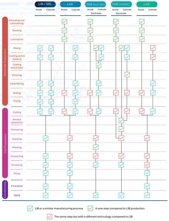 The manufacturing processes for SIBs are strongly compatible with existing LIB production lines compared to lithium–sulfur batteries (LSBs) and sulfuric and oxide-based solid-state batteries (SSBs). Figure 8 illustrates the battery cell production for different battery technologies. While SIB and LIB’s production steps are identical, anode production for lithium-sulfur, solid-state, and lithium-air batteries requires an inert gas or dry room atmosphere due to the metallic lithium and laser application for cutting, slitting, and contacting steps. This compatibility comes from similar fundamental electrochemistry and cell designs, which allow using the same production facilities and equipment. Specifically, the electrode production, cell assembly, and conditioning are similar. This similarity enables the utilization of existing manufacturing capacities and reduces investments. Thus, the transition to SIB production is becoming economically possible for manufacturers already producing LIBs []. Additionally, less expensive and more abundant raw materials influence the scale and location of manufacturing facilities due to variations in material supply chains and costs []. Nevertheless, more cells (assuming identical geometry) must be produced to store the same energy in kWh. This results in higher processing costs due to the need for additional machines to be acquired, installed, and operated. As a result, there has been a reported increase in processing costs of approximately 15% [].