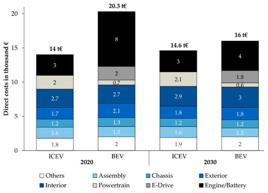 Cost structure of current and future BEVs compared to ICEVs. With permission from [].