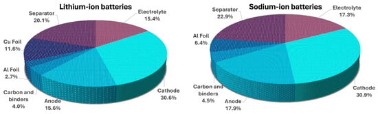 The primary expense in LIBs comprises the cost of the cathode, anode, collectors, separator, and electrolyte []. In contrast, a range of essential supplementary components, including separator, conductive agent, binder, and case, are included in the cost [,] (Figure 10). Substituting copper foil with aluminum as the anode current collector in SIBs significantly influences the cost structure. For example, for cells composed of LMO-synthetic graphite materials, the cost contributions of aluminum and copper as current collectors are 2.7% and 11.6%, respectively. This substitution results in a 55% considerable mass decrease. Consequently, BatPaC calculations show that this material exchange is projected to lower the cost by 8.7% relative to the reference cell materials []. Using lighter and less expensive aluminum instead of copper reduces inactive materials in SIB full cells. This leads to a higher energy density, which prepares the SIBs for use in passenger and commercial EVs. Substituting lithium with sodium only results in a slight cost reduction from 16.1 to 15.8 EUR/L, which has minimal impact on the final cell price [].