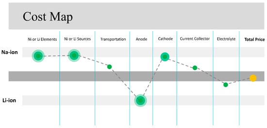 Competitive advantages in commercialization cost factor of SIBs and LIBs. The circle’s radius highlights the intensity of the advantages of each parameter. The figure is schematically produced based on the [,,,,,].