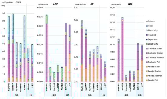 SIBs are known for their eco-friendliness and avoidance of using rare or critical materials. It is currently challenging for SIB to match LIB in terms of global warming potential (GWP). However, ongoing efforts to reduce greenhouse gas emissions associated with SIB’s production are expected to help them become more competitive with LIB’s. Raw materials and energy sources for processing will play a significant role in the overall GWP of future battery cells, potentially outweighing considerations of cell chemistry. SIBs using abundant materials like NaMMO (Na2/3(Mn0.95Mg0.05)O2), NaPBA (Na2Fe[Fe(CN)6]), and NaNMMT (Na1.1(Ni0.3Mn0.5Mg0.05Ti0.05)O2) are a better choice, as they do not rely on critical materials, and have a positive life cycle that outperforms LIBs. NaMVP (Na4MnV(PO4)3) cells have some unfavorable results, which can be partially attributed to specific vanadium production processes. However, alternative sourcing methods can help mitigate this issue. SIBs generally cause higher acidification potential impacts because of the anode active material, HC, which usually comes from petroleum coke []. While this material has good environmental performance, the lack of specific sulfur dioxide (SO2) abatement technologies in the process needs further attention. Figure 12 provides information on the potential environmental impacts of producing 1 kWh of battery cell capacity []. SIB coin cells have much lower energy densities (0.1–0.4 Wh/kg) and consequently, a much higher environmental impact, with approximately 56,000 kg CO2eq/kWh for lab-scale scenarios and approximately 5200 kg CO2eq/kWh for industrial-scale scenarios [].