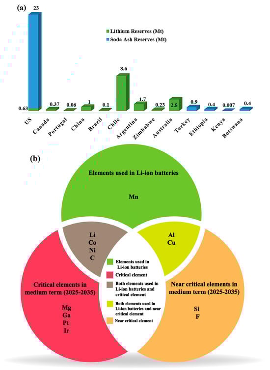 (a) Li and Na reserves (Soda Ash) in the world reported in 2020. Data was drawn from []. (b) Critical and near-critical elements for the medium term (2025–2035). Data was drawn from [].