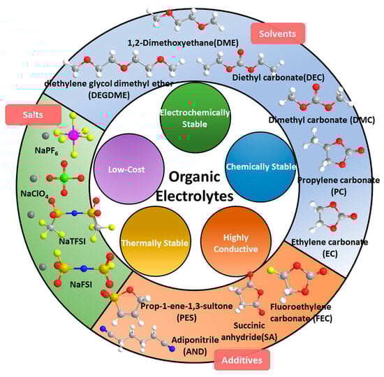Typical components of organic electrolytes based on ethers and esters in SIBs. With permission from [].
