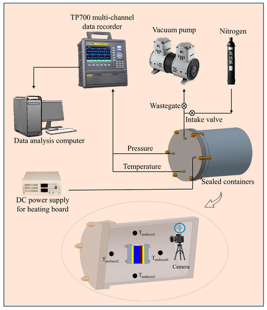 The primary equipment used in this study is a self-made sealed pressure vessel with a capacity of 1000 L. Its basic components include the chamber, signal acquisition system, gas intake and exhaust system, and thermal runaway trigger system. Figure 1 shows the composition of the experimental equipment.