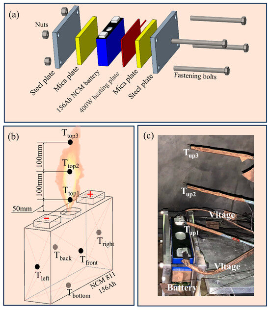 Figure 2. Battery installation. (a) Battery clamping structure. (b) Thermocouple placement locations. (c) Actual thermocouple placement.