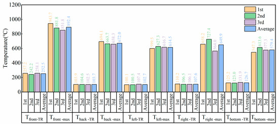 Figure 4 shows the inflection point temperatures and maximum temperatures at each monitoring point across three experiments [51], along with the calculated average values for the three experiments. The average maximum inflection point temperature on the heated side (front), Tfront-TR, is 252.5 °C, due to the direct heating effect of the heating plate. The inflection point temperature at the bottom of the battery ranks second at 126.7 °C. This may be because the bottom of the battery is directly placed on a mica plate, resulting in no heat conduction with the air. The temperatures on the left and right sides of the battery are lower because they are exposed to air, creating thermal convection and causing some heat loss. The back of the battery has a relatively low temperature due to its distance from the heat source, leading to significant heat loss during heat transfer. The inflection point temperatures at the back, left, and right sides of the battery are nearly identical, at 103.7 °C, 102.7 °C, and 107.6 °C, respectively. The order of the highest temperatures at the six monitoring points from highest to lowest is: Tfront-max > Tback-max > Tright-max > Tleft-max > Tbottom-max. This indicates that the largest surfaces of the battery have the highest temperatures due to the maximum contact area with the wound cores, resulting in efficient heat conduction. Since the copper current collector has better thermal conductivity than the aluminum current collector, the small surface near the cathode has a higher temperature than the small surface near the anode. The bottom surface of the battery has the lowest Tbottom-max temperature due to the heat conduction and heat absorption by the electrolyte’s evaporation.