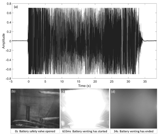 Sound and video signals during thermal runaway. (a) Amplitude of sound signal during thermal runaway. (b) Image of safety valve opening during thermal runaway. (c) Image of flame generation at the start of thermal runaway combustion. (d) Image after completion of thermal runaway ejection.