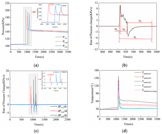 Figure 7b illustrates the rate of pressure change inside the chamber during the first experiment. According to the segmentation of the ejection process proposed in the reference [67], the gas ejection stage (De) of thermal runaway is divided into three phases: