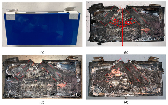 Battery photographs. (a) Battery before thermal runaway. (b) Battery remains after thermal runaway in the first experiment. (c) Battery remains after thermal runaway in the second experiment. (d) Battery remains after thermal runaway in the third experiment.