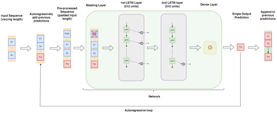Initially, all the input is processed one step at a time, without any input being created (warm-up phase). Subsequently, the same network begins the output generation, proceeding autoregressively. The procedure is shown in Figure 2.