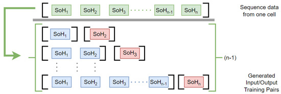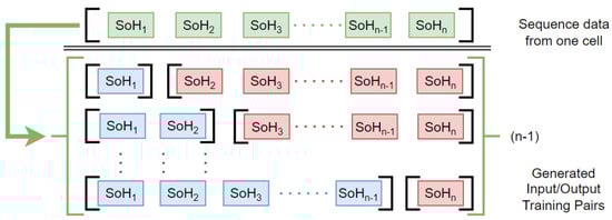 Data relating to cycles with SoH lower than the chosen threshold are removed from the dataset, with the exclusion of the first step below the threshold, which is maintained. Data are then normalized to the 0–1 range. Subsequently, from a sequence of n steps, input and output pairs are created. The input sequences have progressively greater length as the number of past steps grows, while the output always has dimension 1 and is constituted by the observation immediately following the last step of the input. This procedure is summarized in Figure 3.