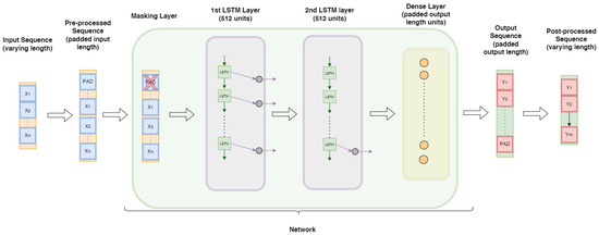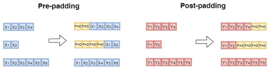 Since deep learning libraries require the input to be of constant length, the maximum length among training input sequences is calculated, and all sequences of shorter length are pre-padded with the arbitrary value −1. This plays the role of the masking value, and steps with this number are ignored and skipped by the masking layer. Pre- and post-padding procedures are represented in Figure 4.