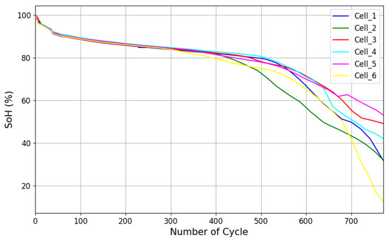 Figure 7 shows the SoH trajectories of the NMC cells. We can notice that, at the beginning, all the battery cells have similar SoH patterns. As we proceed further into the degradation stage, especially after the “knee-point”, the cells’ behavior becomes more unpredictable. This phenomenon is based on complicated electrochemical internal reactions, which lead to capacity and power fade, due to several cell losses such as lithium inventory, active material, and conductivity [21]. A summary of the main features of the recorded data is reported in Table 1.