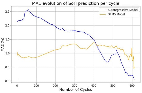 In Figure 8, average models’ performances for SoH prediction throughout various degradation stages are represented. In the early stage, the Autoregressive model achieves an MAE around 2.5%, but as we move further into the degradation stage, the performance improves, reaching a final MAE around 0.25%. Conversely, the error of the OTMS model is approximately stable between 1% and 1.5% throughout all the cycles, except the very last cycles before 70% SoH. The overall SoH prediction MAE of the Autoregressive model is 1.57%, while for the OTMS model is 1.10%.