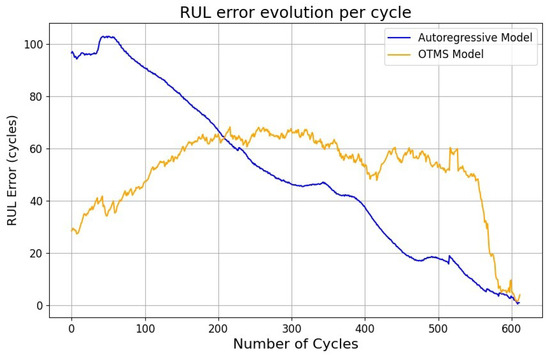Figure 9 reports the RUL estimation error evolution for every cycle until 70% SoH. The errors of the Autoregressive model are high in the early stages, but then they steadily decline towards zero. Conversely, the OTMS model achieves low errors in the early cycles, then they increase, stabilizing around an average error of 60 cycles, and finally they fall towards 0 at the very end of the useful life. The overall RUL error of the Autoregressive model is 50.7 cycles, while for the OTMS model, it is 51.6 cycles.