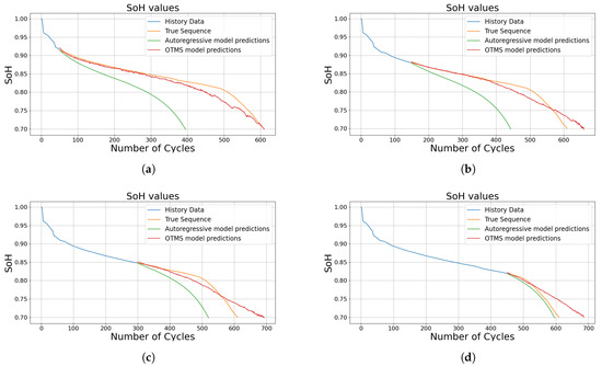 SoH trajectory predictions for different degradation stages performed by Autoregressive and OTMS models on one test cell. (a) SoH values with prediction starting point at 50 cycles. (b) SoH values with prediction starting point at 150 cycles. (c) SoH values with prediction starting point at 300 cycles. (d) SoH values with prediction starting point at 450 cycles.