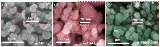 The chemicals used in the experiment were all of analytical grade (AR) and used directly without any purification. In total, 25 mL of 0.025 mol/L MnSO4 and 25 mL of 0.15 mol/L KMnO4 were mixed and stirred at room temperature for 30 min. Then, the mixture was transferred into an 80 mL Teflon-lined autoclave and kept at 160 °C for 12 h. The synthesized brown powder was washed with anhydrous ethanol and deionized (DI) water three times, respectively, and dried at 60 °C overnight. Finally, it was annealed in a muffle furnace at 2°/min for 2 h at 300 °C, 400 °C, and 500 °C. The final obtained samples were named δ-MnO2, δ-MnO2-300, δ-MnO2-400, and δ-MnO2-500, respectively.