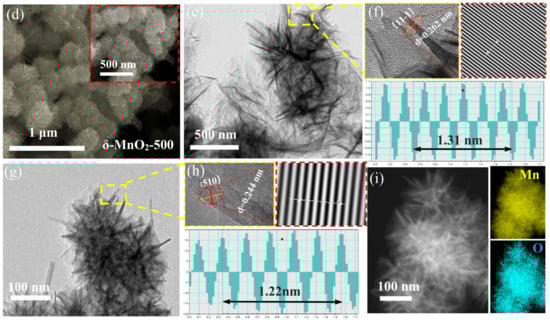 The morphology of the four samples was observed using SEM. They are all microspheres consisting of smooth and intersecting nanosheets (Figure 2a–d). This unique structure ensures that the nanosheets possess sufficient gaps between them to provide channels for the transport of ions and accelerate the reaction rate. It can be observed that some nanorods are interspersed between the microspheres owing to the high annealing temperature. They may not only clog the pores of the matter, but also promote the agglomeration phenomenon. This is the main reason for the small specific surface area of the δ-MnO2-500 material. At the same time, the creation of new phases changes the chemistry of the material and affects its electrochemical properties. This will be discussed in detail in the next section. In addition, the microstructures of the δ-MnO2-400 and δ-MnO2-500 powders were investigated using HRTEM, respectively, as shown in Figure 2e–h. The interplanar spacings of 0.262 nm and 0.244 nm can be indexed to the (11-1) and (510) crystal planes, respectively, and can be calculated from line profiles. As seen the EDS (Figure 2i), the Mn and O elements are uniformly distributed on the surface.