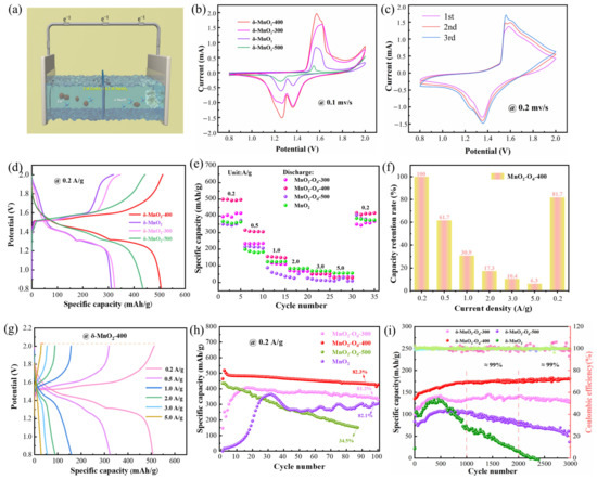 Electrochemical performance: (a) The ZIB structure of δ-MnO2-X; (b) CV curves of δ-MnO2-X; (c) CV of δ-MnO2-400 at 0.2 mV/s; (d) GCD curves of four electrodes; (e) rate capability; (f) capacity retention rate of δ-MnO2-400; (g) GCD curves of δ-MnO2-400; (h,i) cycling performance at 1.0 A/g.