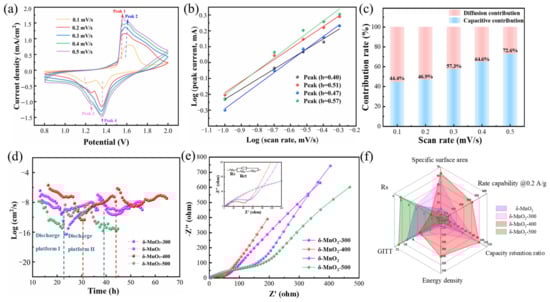 Reaction kinetics: (a) CV curves of δ-MnO2-400 at 0.1–0.5 mV/s; (b) log(i) versus log(v); (c) capacitive contribution ratios; (d) GITT; (e) EIS; (f) radar chart.