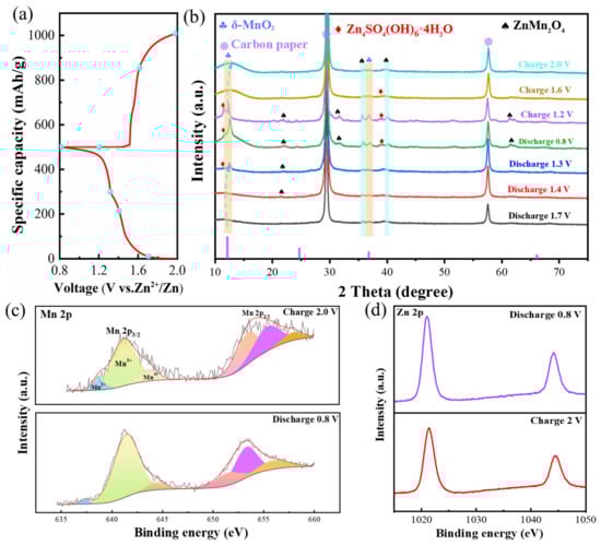 In order to further explore the energy storage mechanism, we studied the structure of δ-MnO2-400 samples at specific charging/discharging states using ex situ XRD and XPS. Figure 5a,b show the XRD patterns in different states. During the first cycle of the discharge, the (001) plane shifts 0.5° from 12.16° to the left, suggesting that Zn2+ is successfully inserted into the host structure. In the subsequent reaction process, some additional peaks are generated at 11.58° and 38.94°, which can be indexed to the zinc sulfate hydroxide hydrate (Zn4SO4(OH)6·4H2O, ZSH, PDF: 44-0673) phases [62]. Also, the ZnMn2O4 (ZMO, PDF: 77-0470) phase is detected. When charged to 2.0 V, the (001) crystalline peak returns to 12.14°, which can be attributed to the shuttling effect of Zn2+. In addition, the new peaks gradually disappear as the reaction proceeds again, demonstrating the high reversibility of the δ-MnO2-400 sample. Then, we studied the XPS at different voltages of the electrodes in order to verify the phase transition process. The Mn 2p spectra are convoluted into three peaks, situated at 638.78, 641.08, and 643.68 eV, corresponding to Mn2+, Mn3+, and Mn4+, respectively (Figure 5c). The presence of Mn2+ may be caused by the embedding of Zn2+ resulting in the reduction in part of the Mn3+ to Mn2+ [63]. It also can be observed that the intensity of the Mn3+ and Mn4+ peaks diminishes at complete discharge to 0.8 V. Figure 5d shows the Zn 2p spectra with characteristic peaks at 1020.98 eV and 1044.08 eV. The decrease in peak intensity compared to the discharge state is due to the precipitation of Zn2+ and the decomposition of ZSH.
