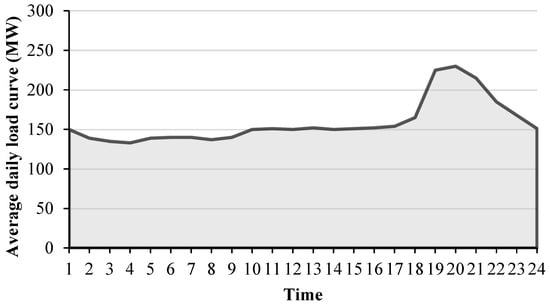 Lombok is one of the southern islands of Indonesia with a total land area of 4725 km2 and a population of 3.7 million; it is not connected to the national electricity grid [1]. Lombok faces a critical challenge in terms of peak demand–supply. Figure 1 shows the average daily load curve by 2020 [2]. As can be seen, the gap between the peak load and the base load reaches 100 MW during peak hours. In Lombok’s context, a 100 MW gap between peak and base load is substantial because it indicates a sharp increase in demand during peak times. Lombok’s power grid, being relatively small and isolated, may struggle to meet this surge in demand without adequate infrastructure. This can lead to grid instability, the need for expensive upgrades, or even blackouts. The integration of battery energy storage systems (BESSs) is, therefore, critical, as these systems can help balance the grid by storing excess power during low-demand periods and discharging it during peak demand, ensuring a more stable and reliable power supply.