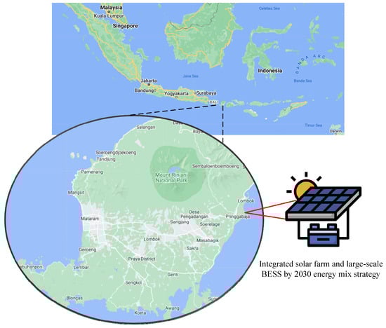 Thanks to the growing interest in renewable energy integration with a probabilistic nature, BESS units have assumed an important role in the power grids. BESSs are used for various purposes such as load shifting, increasing reliability, voltage support, reducing cost, minimizing power loss, etc. [34]. The mixture of a variety of metals and electrolytes in these types of batteries provides them with varied features that make them suitable for diverse situations. The lithium-ion battery is an electrochemical storage that uses a reversible intercalation process to store and transfer electrical energy [35,36]. This process involves the movement of Li+ ions between two different types of electrode materials that are kept apart by an electrolyte solution that conducts lithium ions. Lithium-ion batteries have a wider range of rated power and endurance and offer greater flexibility in terms of grid services. With unique features, lithium-ion BESSs are considered inseparable parts of the future energy mix strategy in Lombok by 2030. In this section, the concepts of LCA and LCC and their corresponding indicators are discussed. Also, the scope and goal of the model based on the 1 kWh capacity of the battery as a function unit are represented. It should be noted that the proposed LCA and LCC analysis are carried out on lithium iron phosphate (LiFePO4), which is abbreviated LFP. Figure 2 shows the overview of Lombok Island, as well as the location of integrated solar and large-scale BESSs in eastern Lombok.