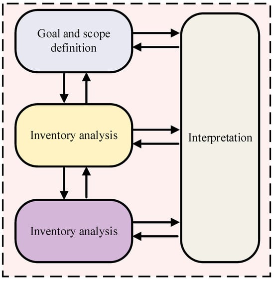 The LCA is a highly regarded technique that evaluates the environmental effects of a process, product, or service over its lifetime [37]. The ISO 14040/14044 standards provide the foundation for the LCA process as given in Figure 3 [38]. The goal/scope specification is the first step. The main action of this step is to define the function unit. In the case of a BESS, 1 kWh of stored electricity is considered a function unit. Next, an inventory list is gathered that describes the interactions that occur between the organizations that conduct the operations in the product’s life cycle and the outside world. The inventory data are allocated to environmental impact indicators in the ensuing life cycle impact assessment (LCIA). In this step, all input, output, and materials per function unit are classified and characterized based on the considered indicators using the CML-IA method. Also, the normalization phase can be used as an optional phase for the better analysis of results based on the standard normalization factor [39]. The CML-IA uses a collection of characterization parameters to measure environmental impacts across several categories, including human health, ecosystem quality, and resources. This approach assesses emissions and resource consumption across a product’s life cycle, allowing for the assessment of possible environmental impacts connected with its manufacture, use, and disposal stages. This technique helps identify hotspots and guide decision-making to environmentally friendly activities and product designs.
