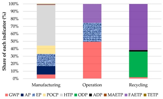 This section provides the numerical results on LCA based on the previous description. As mentioned, 10 environmental indicators are considered during the LFP lifespan. The share of impact indicators on each subsystem (manufacturing, operation, and recycling) is given in Figure 5. As can be seen, the operation subsystem is responsible for much GHP due to electricity provided during the charging scheme. However, if the share of renewable energy integration increases in Lombok, this value will be reduced in the 2030 energy mix scenario. Due to higher non-methane volatile organic and nitrogen oxide generation during the manufacturing process, this subsystem contributes to the HTP indicator. The freshwater indicator strongly affects the recycling process. As shown in Table 3, because this subsystem creates a high rate of emission to water, the FAETP contributes much more compared to other indicators in this subsystem (1.45 × 102 CTUe/kWh). Due to the presence of hydrochloric acid in the recycling process, the ODP indicator of this subsystem is higher than other subsystems.