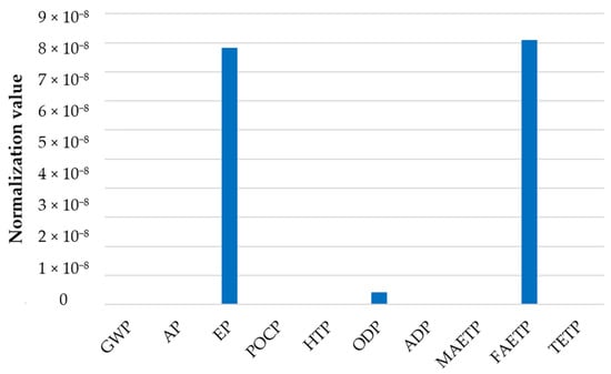 The main part of LCA is to determine the impact indicator share on the reference value. So, the normalization phase based on the normalization factor of the World 2000 dataset is conducted, which is shown in Figure 6. Based on normalization results, FAETP has the most significant impact indicator. After that, EP, and ODP are most effective, respectively. As can be seen in Figure 6, the values of the other indicators are very small compared to the EP, ODP, and FAETP indicators; hence, the value of zero has been included for them on the graph.