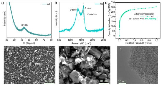 The crystallinity of TF-B520 activated carbon (AC) was conducted using XRD, and the pattern is exhibited in Figure 3a. The absence of a diffraction peak for the reflection of the graphite (002) plane is attributed to the lack of a well-defined long-range order in the arrangement of the carbon atom [22]. The broad and weak peak around 43° is observed in the spectrum, corresponding to the diffraction of the (100) plane, while the low intensity of the diffraction peak demonstrates the amorphous structures [23]. Figure 3b displays the Raman spectra of AC, while the D band (1345.7 cm−1) and G band (1598.5 cm−1) are clearly observed. The ID/IG was calculated as 0.93, indicating lower fractions of the graphitic region and the disordered nature of the carbon matrix. According to the N2 adsorption/desorption curves in Figure 3c, the BET surface area value for AC was measured to be 911.75 m2/g, which is much larger than that of SLP50 graphite. The pore size distribution, shown in Figure S4 (Supplementary Materials), highlights a prominent microporous structure with a pore size ranging from 0.5 to 0.8 nm. A larger surface area implies more adsorption sites, thus conferring a higher adsorption capacity. This facilitates rapid adsorption and desorption of ions on the AC electrode surface. Figure 3d,e show the SEM images of the AC, and the size is mainly distributed in the range of 5–10 µm. Figure 3f illustrates the TEM image of the AC, revealing disordered microstructures characteristic of amorphous carbon.