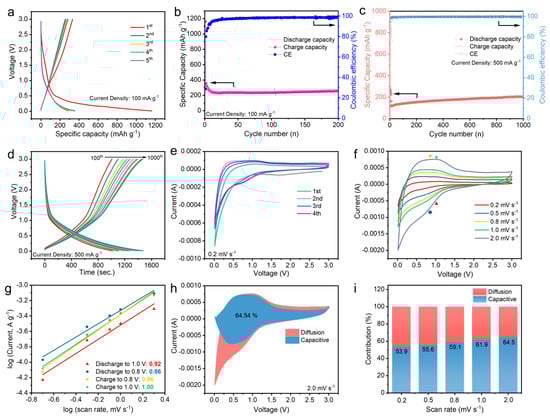 Electrochemical performances of Li//AC half cells in 1M LiPF6 EC/EMC (vol. 1:1) electrolytes. (a) Galvanostatic charge/discharge curves for the initial five cycles, and (b) charge/discharge capacities and Coulombic efficiency at the current density of 100 mA g−1 within 200 cycles; (c) charge/discharge capacities at the current density of 500 mA g−1 within 1000 cycles, and (d) relevant charge/discharge curves at different cycles; (e) initial four CV curves at the scan rate of 0.1 mV s−1; (f) CV curves at various scan rates of 0.2, 0.5, 0.8, 1.0, and 2.0 mV s−1; (g) the linear relation between log(i) and log(v); (h) pseudocapacitive contributions (blue) and diffusion-controlled contributions (pink) at the scan rate of 2.0 mV s−1; (i) ratios of capacitive and diffusion charge storage to the total charge storage at different scan rates.