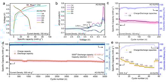 The electrochemical performance of AC (−)//graphite (+) full cells was first investigated by the galvanostatic charge/discharge test. Figure 5a displays the initial five charge/discharge curves of the cell at the current density of 100 mA g−1 with the voltage range between 2.0 and 5.0 V. It is clear that the voltage plateaus corresponding to the anion intercalation behaviour are observed. The charge capacity of the first cycle reaches 90 mAh g−1, but the first discharge capacity is lower than 50 mAh g−1, yielding an initial CE of 50%. The lower CE in the first cycle is probably associated with the parasitic reactions, such as the electrolyte decomposition and self-discharge behaviour. Notably, the subsequent curves are overlapped well, which demonstrates the excellent cyclic reversibility and stability. Correspondingly, the initial five dQ/dV curves are exhibited in Figure 5b, while the peaks are attributed to the plateaus in the charge/discharge curves. The onset voltage for anion intercalation in the first cycle is 3.95 V, and the voltage decreases to 3.81 V in the second cycle and 3.76 V for subsequent cycles. The shift in the onset voltage indicates that the first uptake of anions into graphite interlayers needs to overcome the activation barrier to open the interlayer gaps [21,29,30]. This onset shift is also observed in CV curves of the cell at the scan rate of 0.2 mV s−1 (Figure S6a, Supplementary Materials). Meanwhile, the specific peaks observed in the CV curves are associated with the anion intercalation/de-intercalation behaviours. Moreover, Figure S6b (Supplementary Materials) exhibits CV curves at various scan rates from 0.2 to 2.0 mV s−1, and good reversibility of the cell is demonstrated. Figure 5c exhibits the charge/discharge capacities and relevant CE of the AC (−)//graphite (+) cell at the current density of 100 mA g−1 between the voltage range of 2.0–5.0 V within the 200 cycles. The discharge capacity of 45 mAh g−1 is delivered after 200 repeated charge/discharge processes, yielding a CE of 91.4%. The capacity retention of the cell is higher than 90%, demonstrating an excellent cyclic stability. The cyclic stability of the AC (−)//graphite (+) cell was further explored through the galvanostatic charge/discharge cycle at a high current density of 500 mA g−1. The charge/discharge capacities and CE for 5000 cycles are exhibited in Figure 5d. Obviously, the capacity was still stable after 5000 cycles, yielding a capacity retention of 87.5% with an average CE of 99.3%. Furthermore, as shown in Figure 5e, the reversible discharge capacities of 48.7, 46.1, 41.0, 33.5, 31.4, 27.4, and 26.3 mAh g−1 are maintained at various current densities of 0.1, 0.2, 0.5, 0.8, 1.0, 1.5, and 2.0 A g−1, respectively. Particularly, the capacity of the AC (−)//graphite (+) cell recovered to 47.6 mAh g−1 when the current density was switched back to the initial 0.1 A g−1, exhibiting excellent rate capability and cyclic reversibility. Figure S7a (Supplementary Materials) displays the charge/discharge curves of the cell cycled at various current densities. Obviously, the discharge time reduces with the increasing current density. Figure S7b (Supplementary Materials) illustrates the medium voltage of the cell at various current densities, while the medium voltage drops from 4.2 V to 3.8 V when the current density increases from 0.1 to 2.0 A g−1. This result demonstrates a high operating voltage in the AC (−)//graphite (+) full-cell system.