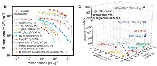 Comparison of performances of the AC (−)//graphite (+) full cell in this work with reported works. (a) Ragone plot of the AC (−)//graphite (+) full cell in this work, and comparison with previously fabricated LICs in the literature. (b) Cyclic performances of the AC (−)//graphite (+) full cell in this work compared with reported dual-graphite batteries.