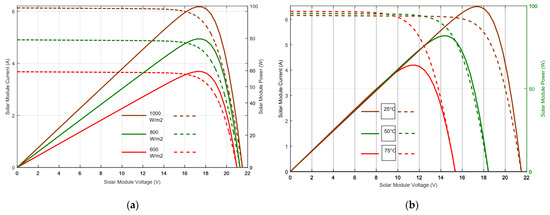 (a) P–V and I–V curves at variable irradiance and constant temperature of 25 °C; (b) P–V and I–V curves at variable temperature and constant irradiance of 1000 W·m−2 [23].