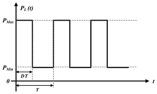 The pulse load profile, as depicted in Figure 5, is characterized by a high-power demand that oscillates between a minimum power level (PMin) and a maximum power level (PMax) over a defined period (T). The frequency of this load can be expressed as F = 1/T, indicating how often the load cycles between its minimum and maximum values within a given timeframe. Additionally, the duty cycle of the load is a crucial parameter; it quantifies the proportion of the period T during which the load is active. This duty cycle is essential for understanding the load’s impact on the system, as it represents the percentage of time within each cycle that the maximum power demand is exerted.