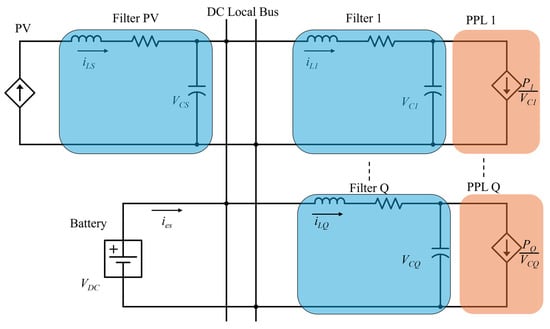 Our proposed architecture examines resistive and pulsed power loads (PPLs) ad illustrated in Figure 6. We model PPLs as voltage-controlled current sources with power levels switching between Pj = PL (when active) and Pj = 0 (when inactive). The DC bus voltage VDC remains constant, and the injected current stabilizes the system during PPL operation. RLC filters, including supercapacitors for high capacitance and fast response, stabilize the overall system and manage fluctuations from the PPLs.