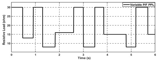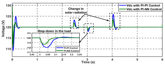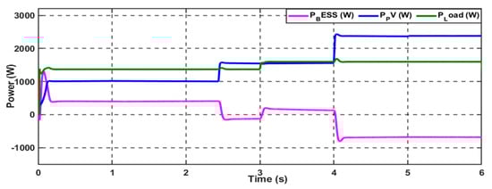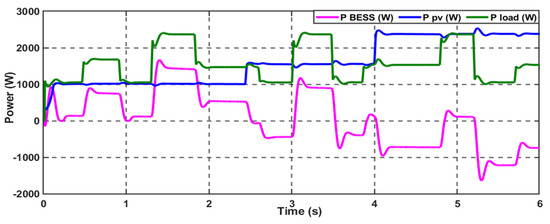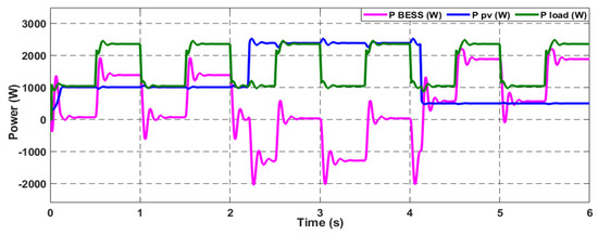 In this case study, the effectiveness of the proposed control scheme in enhancing the DC microgrid stability is evaluated under a standard variable DC load with a 20% step-down change in the total connected load; the load profile is demonstrated in Figure 9. This load profile is represented by a variable resistance connected to the common bus of the DC microgrid. Firstly, the performance of the proposed system was investigated with the conventional PI-PI control scheme; the system can supply the load with the requested power through the hybridization between the PV generation system and the battery, as Figure 10 depicts. The MG exhibits variations in solar radiation at a time equal to 2.5 s and 4 s; the combination of the PV and battery can fulfill the load demand. The system can supply the load when a step-down change occurs at t = 3 s.