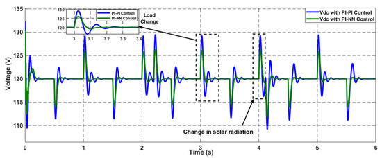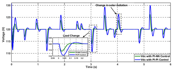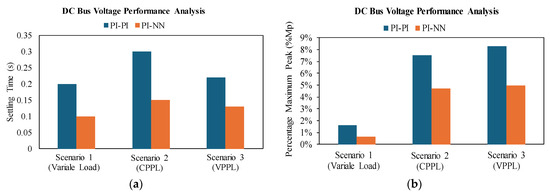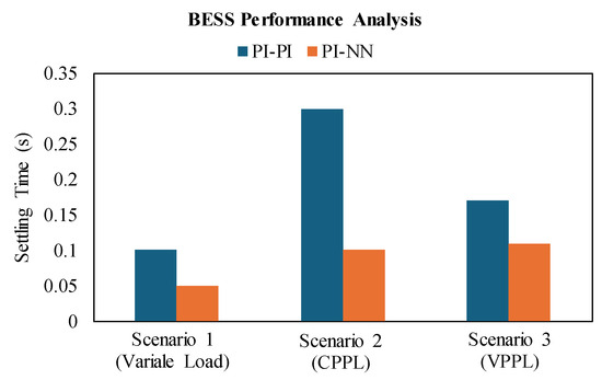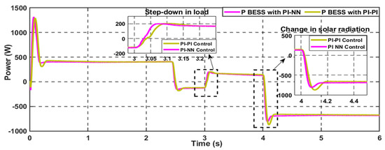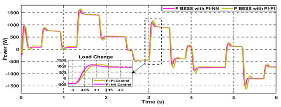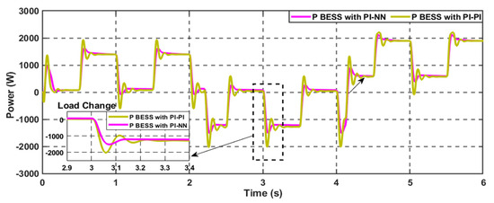 In contrast, the proposed hybrid NN-PI control scheme has enhanced the overall system transient stability, as illustrated in Figure 27b. During this severe operational scenario of high pulsed power load demand with a variable rate of change, the proposed scheme can manage the power-sharing well while decreasing the stress on the BESS during the charging and discharging periods in the forms of reducing the percentage of both over and under overshoot of the generated power. Besides, the overall stability of the common DC bus voltage has been improved with less settling time and %Mp compared to the conventional control scheme.