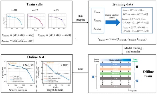 In addition, there is an issue that must be considered. The labeling data of many batteries in practical applications are very limited, and traditional supervised learning methods make it difficult to construct accurate RUL prediction models effectively. Transfer learning becomes an effective method to solve this problem by transferring the knowledge of existing models to new domains and achieving good generalization ability even with a small number of samples [28,29,30]. When using the transfer learning method, the source domain contains a large number of batteries rich in labeled data, while the target domain is a battery with scarce labeled data. Fine-tuning (FT) is one of the most commonly used transfer learning methods, and many research efforts have enhanced model generalization by adjusting specific layers within the network [12,31,32]. Lu et al. [33] used the battery capacity degradation data provided by NASA and the University of Maryland to transfer the NASA battery model to the battery model of the University of Maryland through transfer learning, effectively reducing the number of model training in the target domain, so as to predict the health state of the battery. Tan et al. [34] proposed a capacity estimation method based on model fine-tuning. The model is based on LSTM combined with a fully connected layer. During the transfer process, the model is fine-tuned with the first 25% data of the new battery to predict the discharge capacity of subsequent cycles. Considering that our study does not have manual feature extraction but is based on the capacity data of batteries, we will also use the transfer method of model fine-tuning.