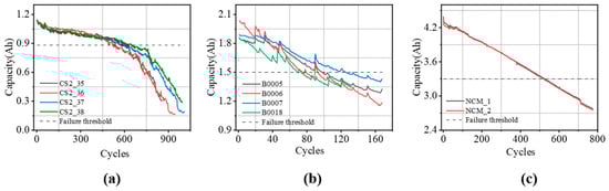 Capacity degradation curves of batteries NASA, CALCE, and NCM. (a) CALCE batteries. (b) NASA batteries. (c) NCM batteries.