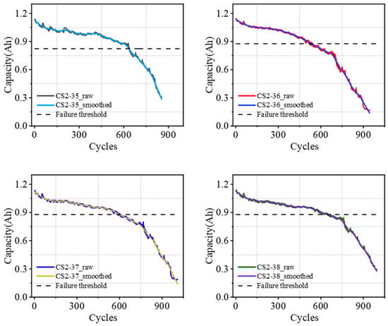 Capacity degradation curves of batteries CALCE before and after smoothing.